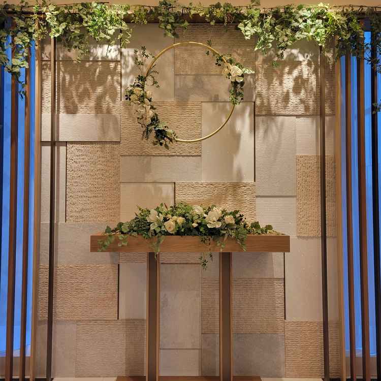 チャペルに白に造花があって可愛らしい印象でした。披露宴会場は狭いですが窓があり外の光が柔らかく射し込むため(見学日は曇り)窮屈感はありません。