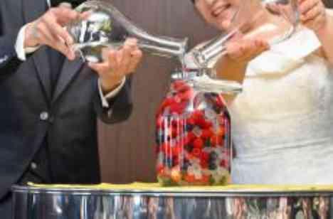 再入場後お二人の行った演出は“果実酒ラウンド” ゲストの皆様のテーブルを回りお二人の持っている瓶に果物と砂糖を入れてもらいます ゲストの方々と近くでコミュニケーションを取ることができます! 最後にはお二人からお酒を入れて完成です! この果実酒が出来上がるのは2.3ヶ月後です 出来上がったお酒を飲みにゲストをお二人の新居へ招待 結婚式後にも楽しんでいただける演出です