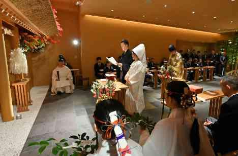 ホテル内神殿は、熱田神宮の御分霊を祀った本格神殿。 憧れの白無垢・綿帽子でかっちりと行いました。挙式フロアが貸切となるため、大切なご家族、ゲストの皆様と、厳かながらも暖かみのある誓いのひと時をお過ごし頂きました。 新郎様の誓詞奏上は、聞き取りやすく穏やかな声でしっかりと誓いを立ててくださいました。