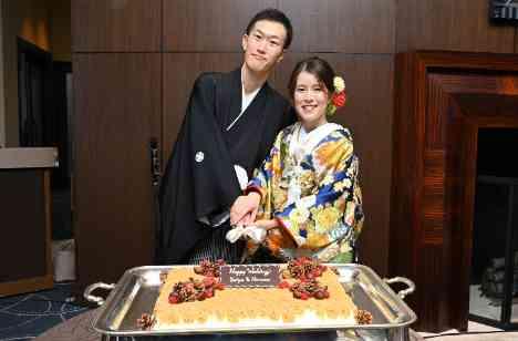 挙式から雰囲気をガラッと変えて、青地にゴールドやイエロー系のお花が映える華やかな色打掛に。 扉がオープンして入場した瞬間には、ゲストから歓声が上がりました。 色打掛でケーキ入刀も。モンブランケーキは、挙式を行った秋を意識してデザインを考えました。大きなモンブランにお二人もテンションが上がっていました。