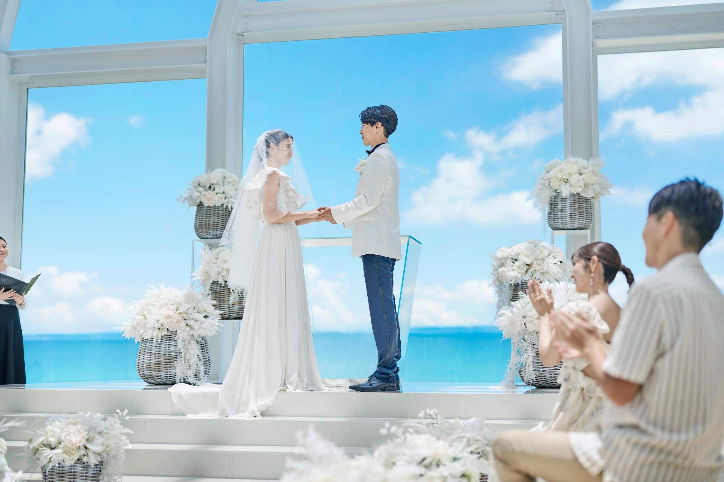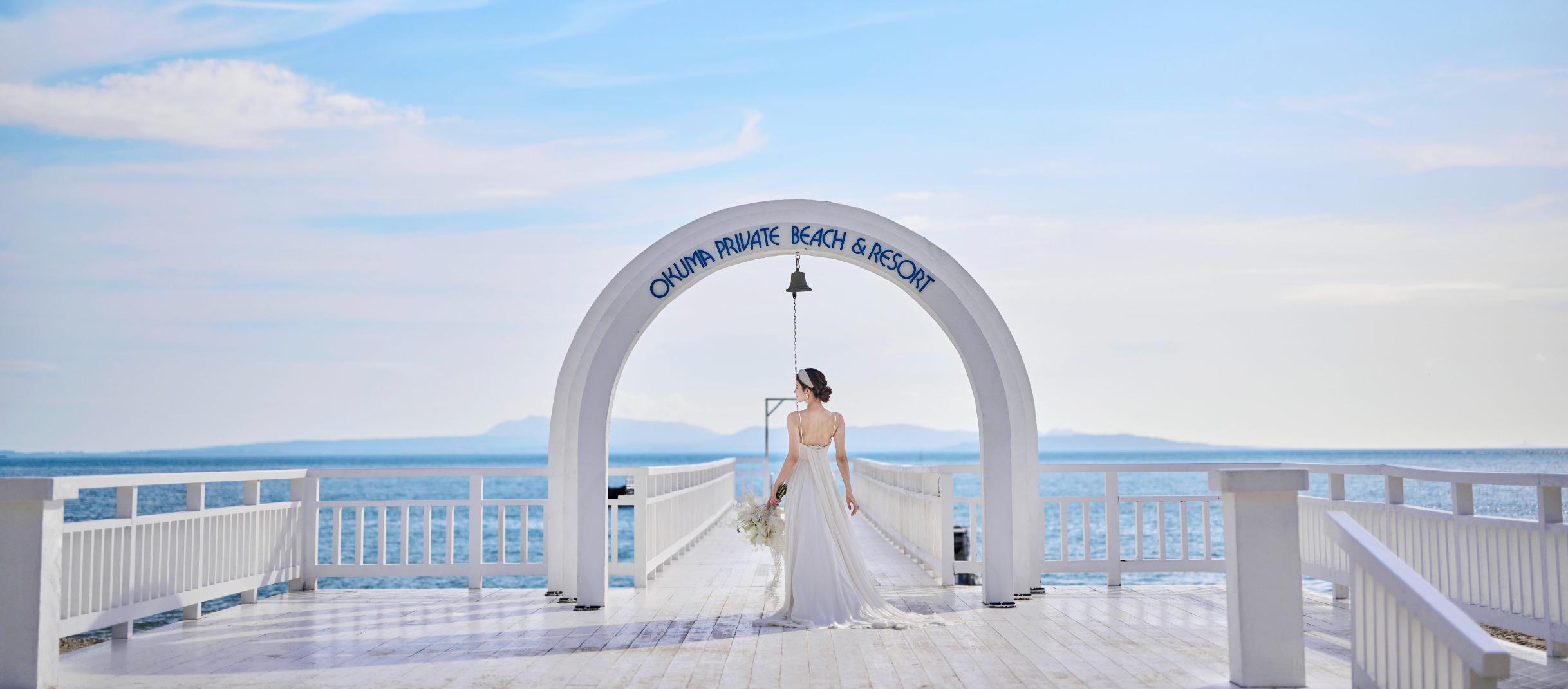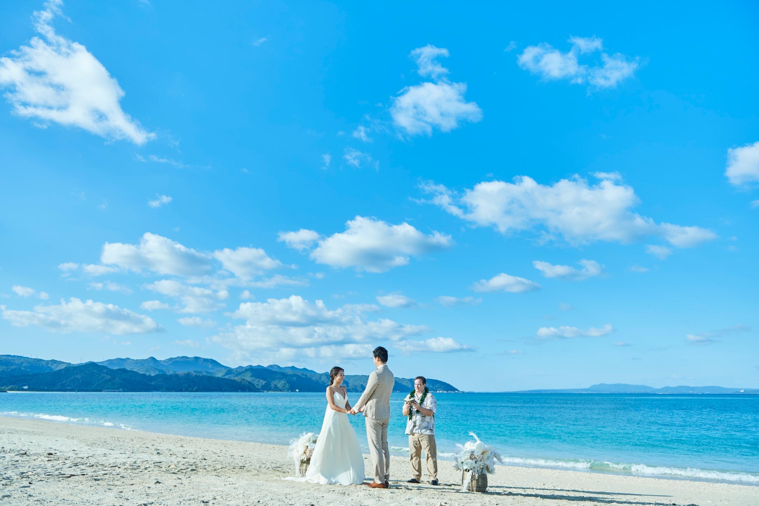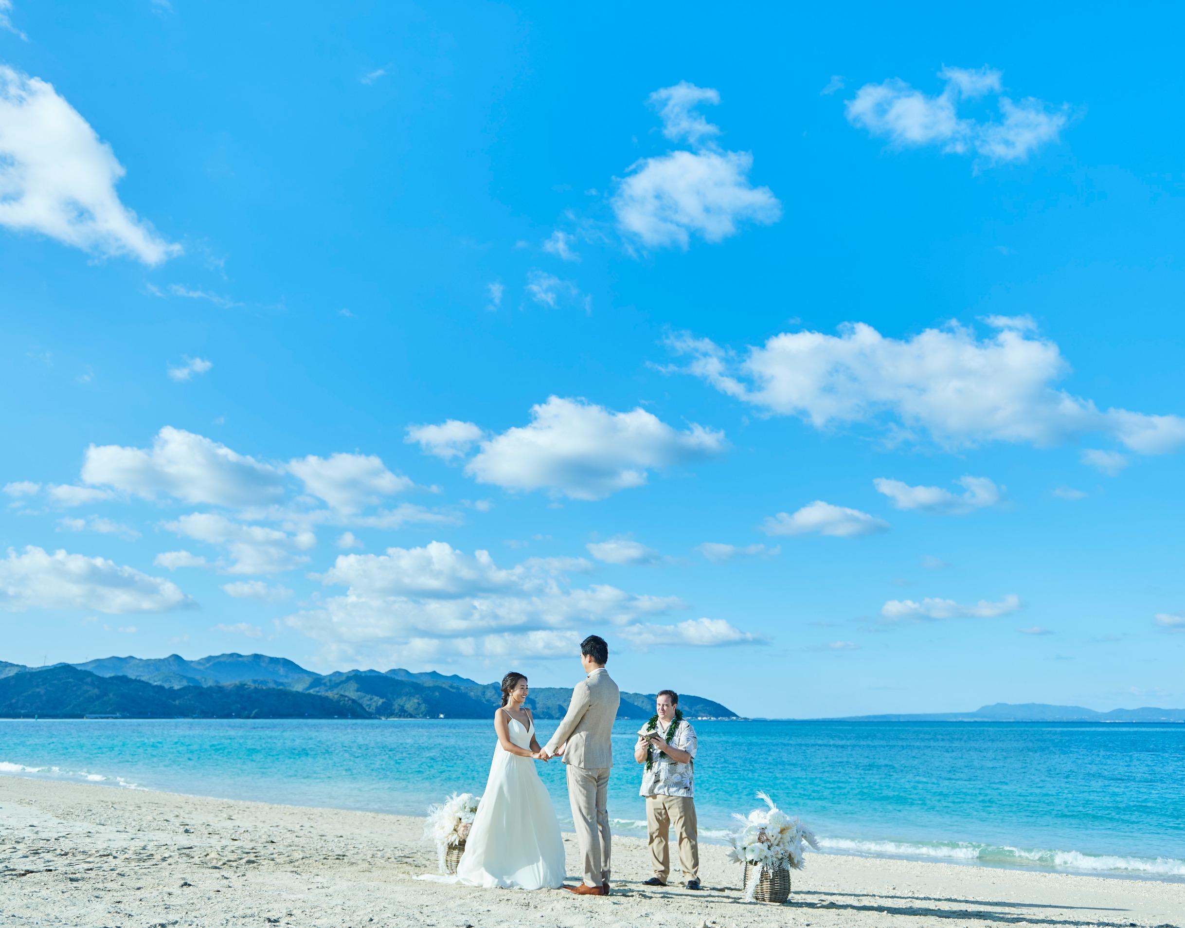 どこまでも続く白砂のオクマビーチがウエディング舞台。太陽の光と波音と心地よい海壁を感じながら自然に包まれたセレモニーを。