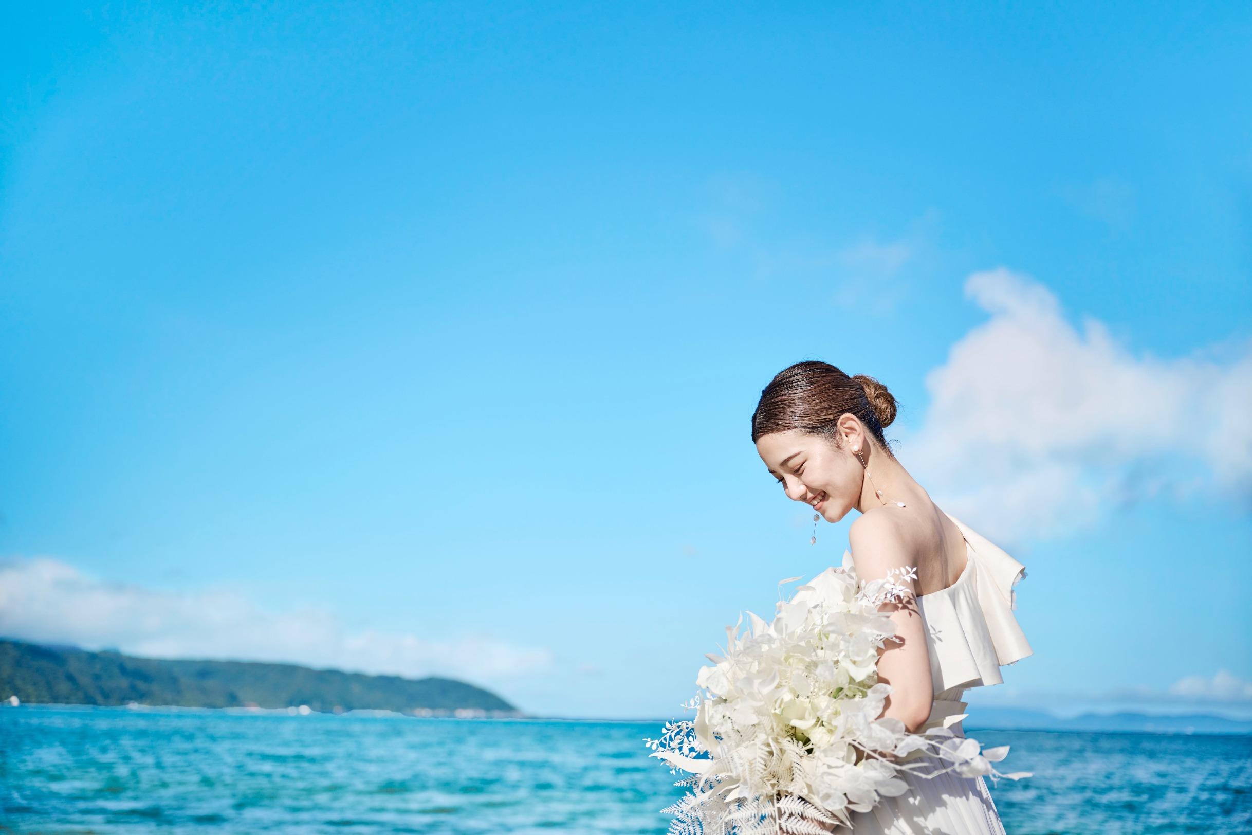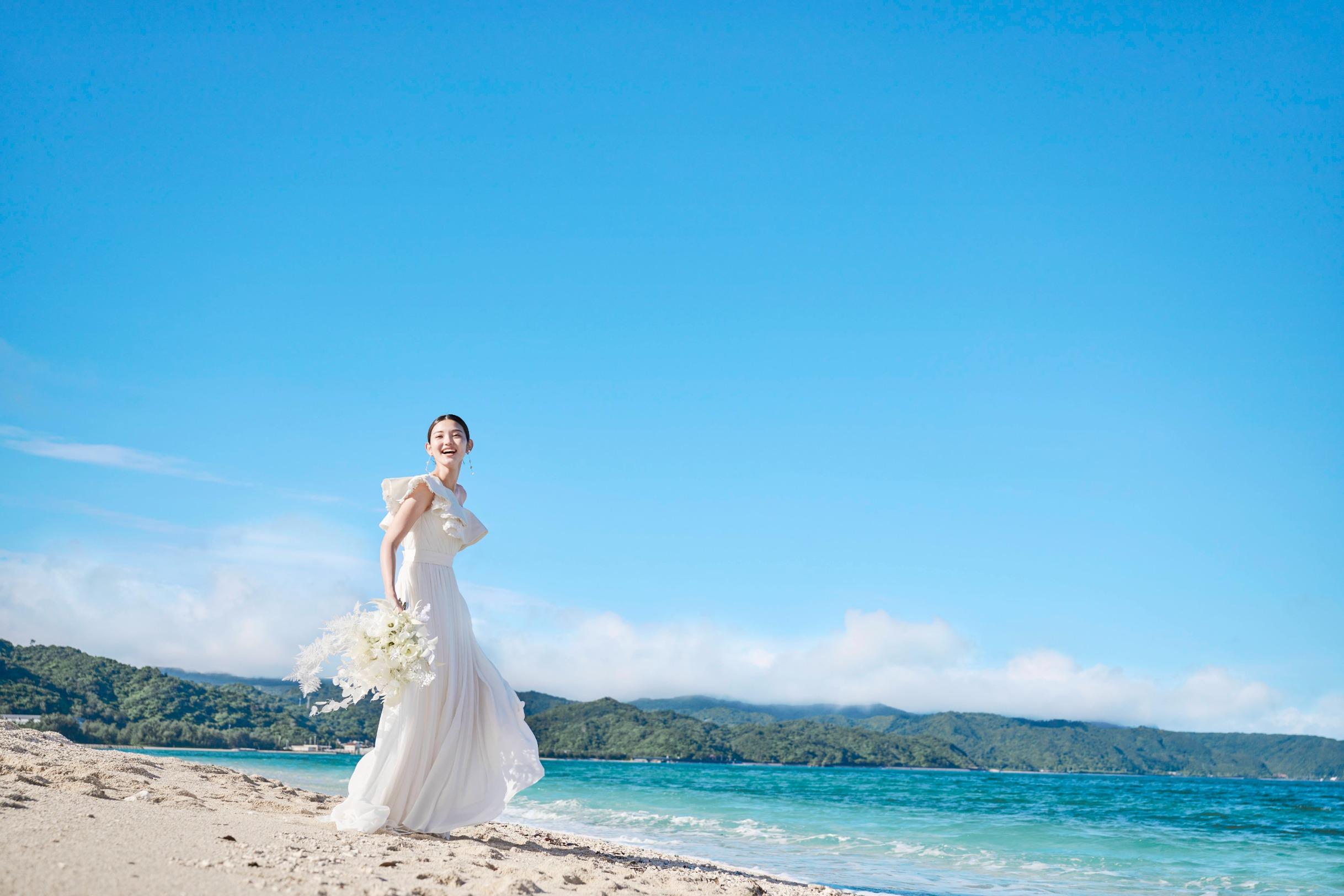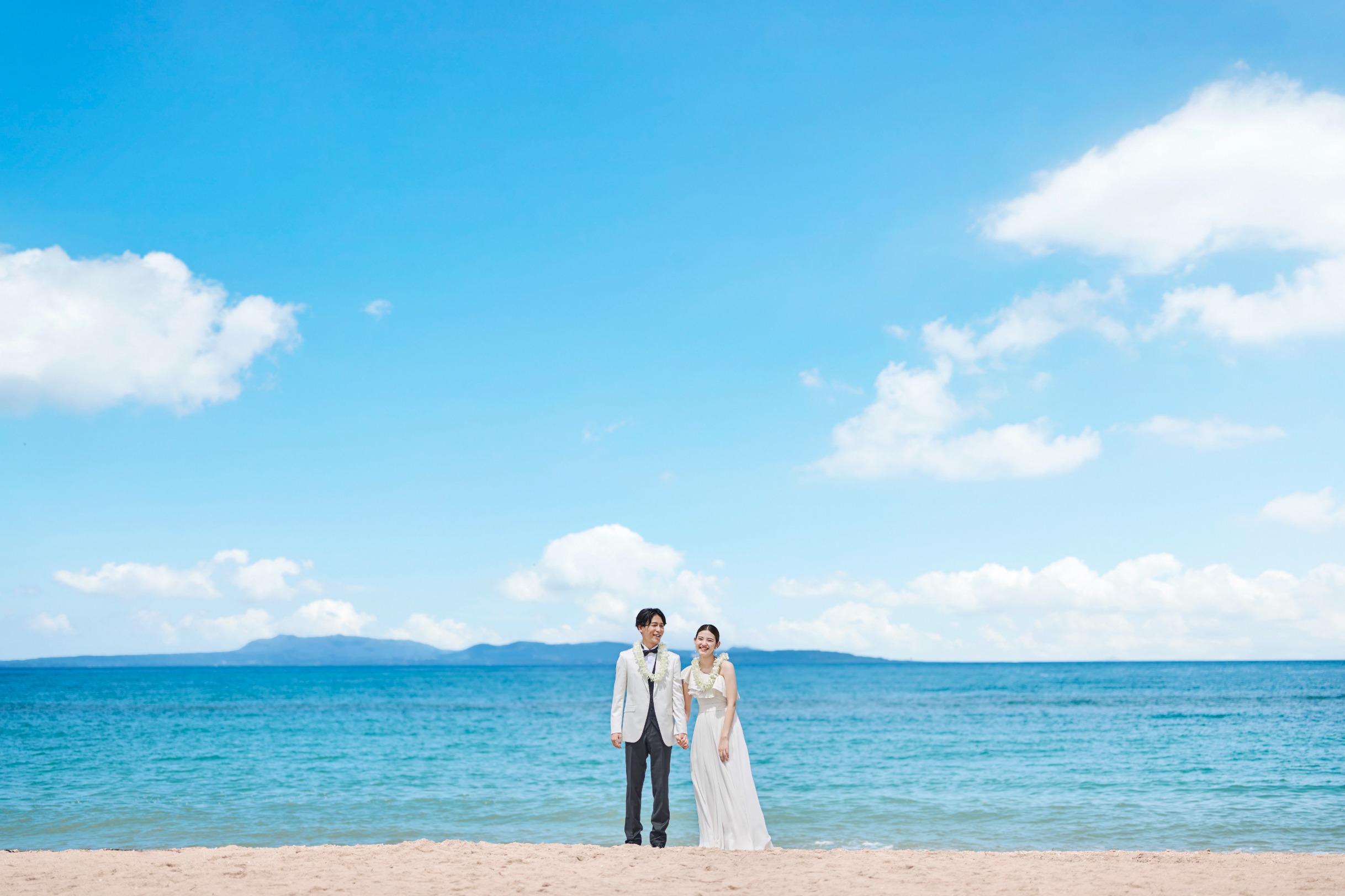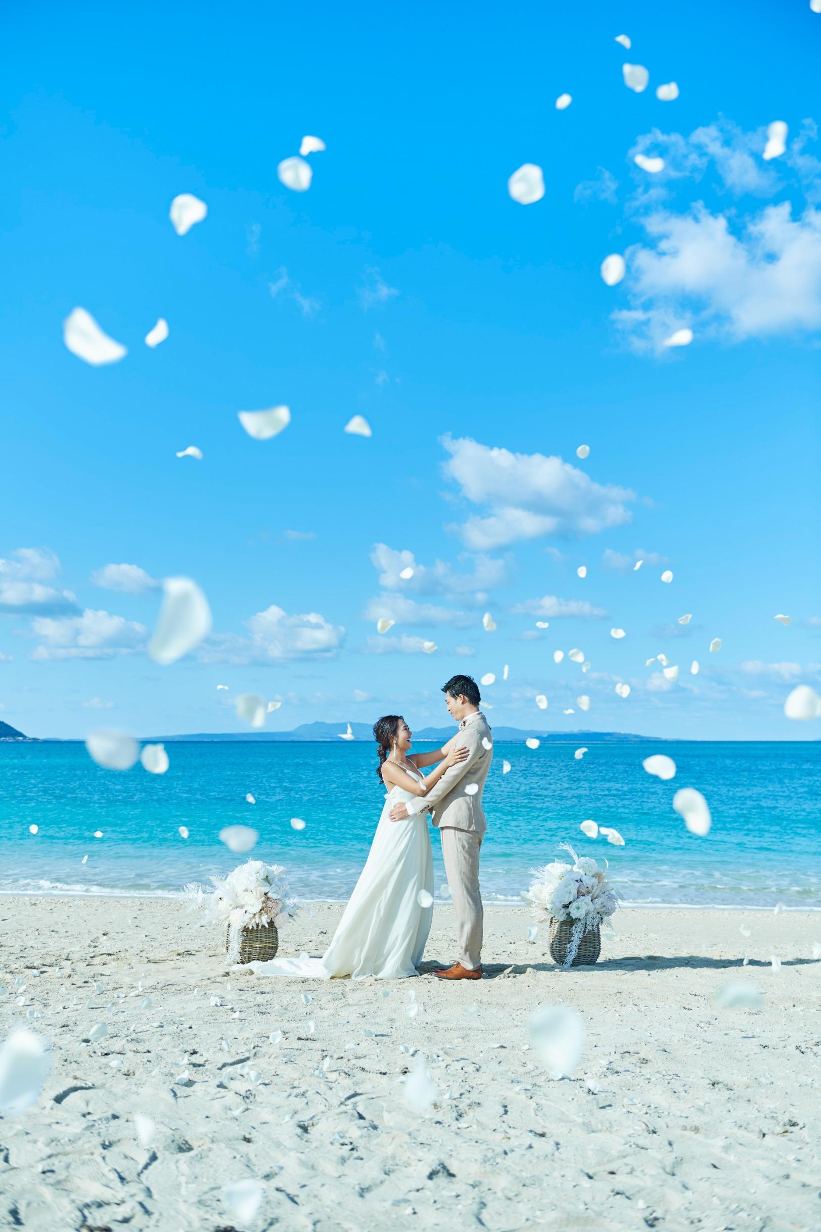 見渡す限りの大空と海、白く輝く砂浜と鮮やかなブルーを背景にリゾートウエディングを満喫した最高のビーチフォトウエディングを。