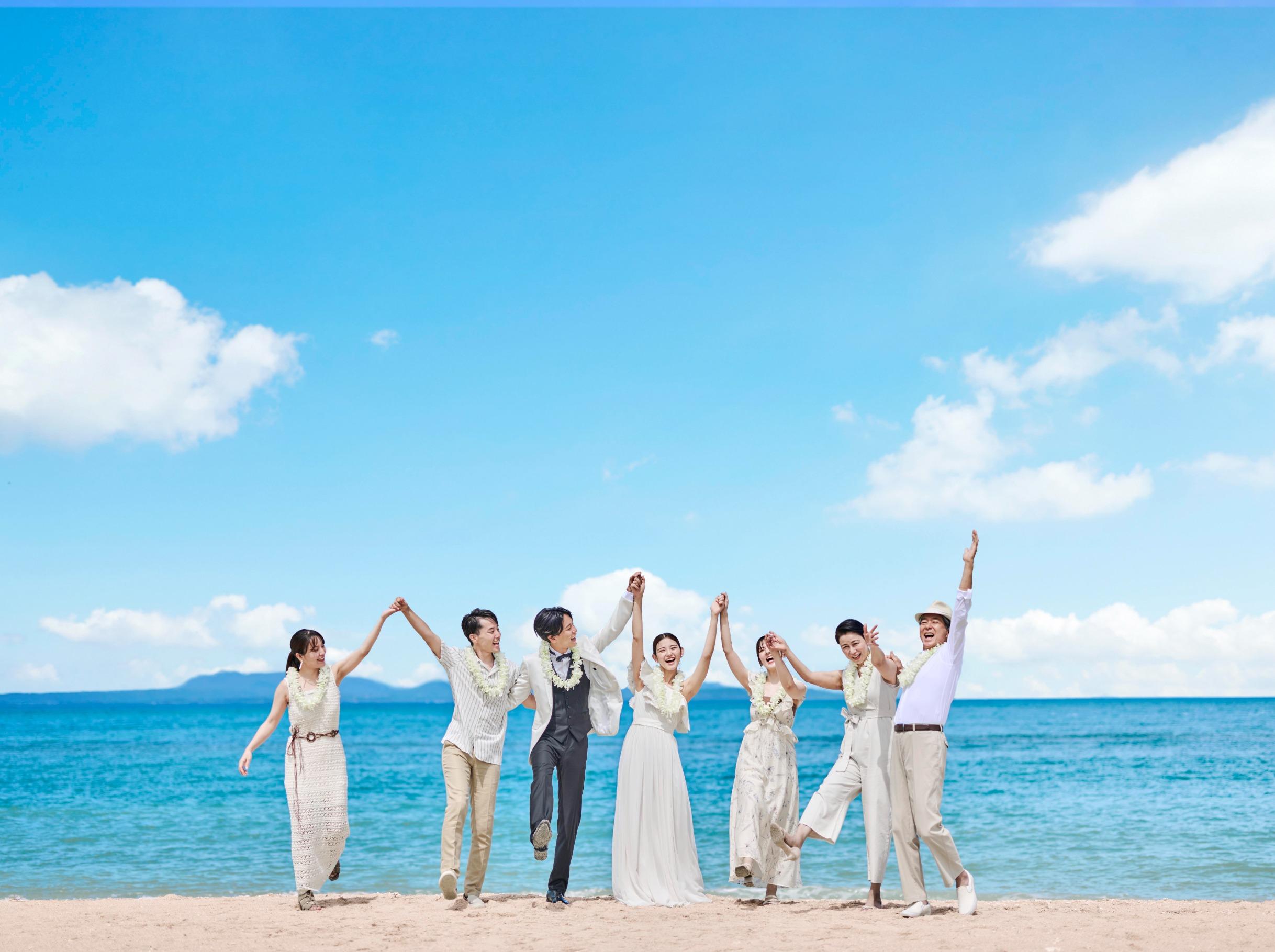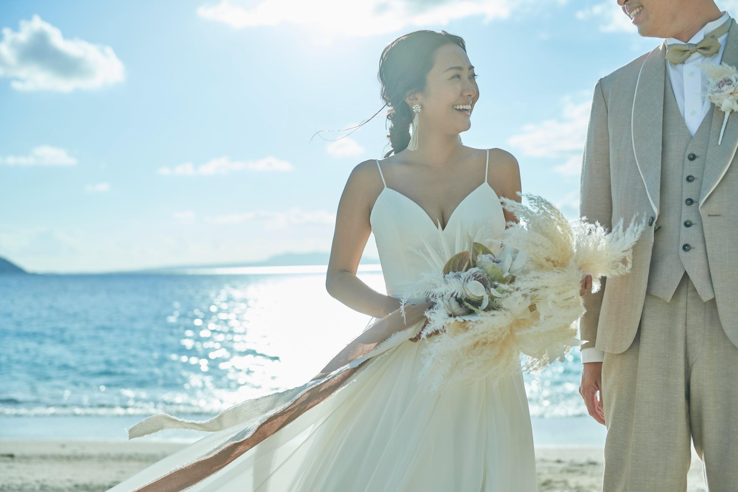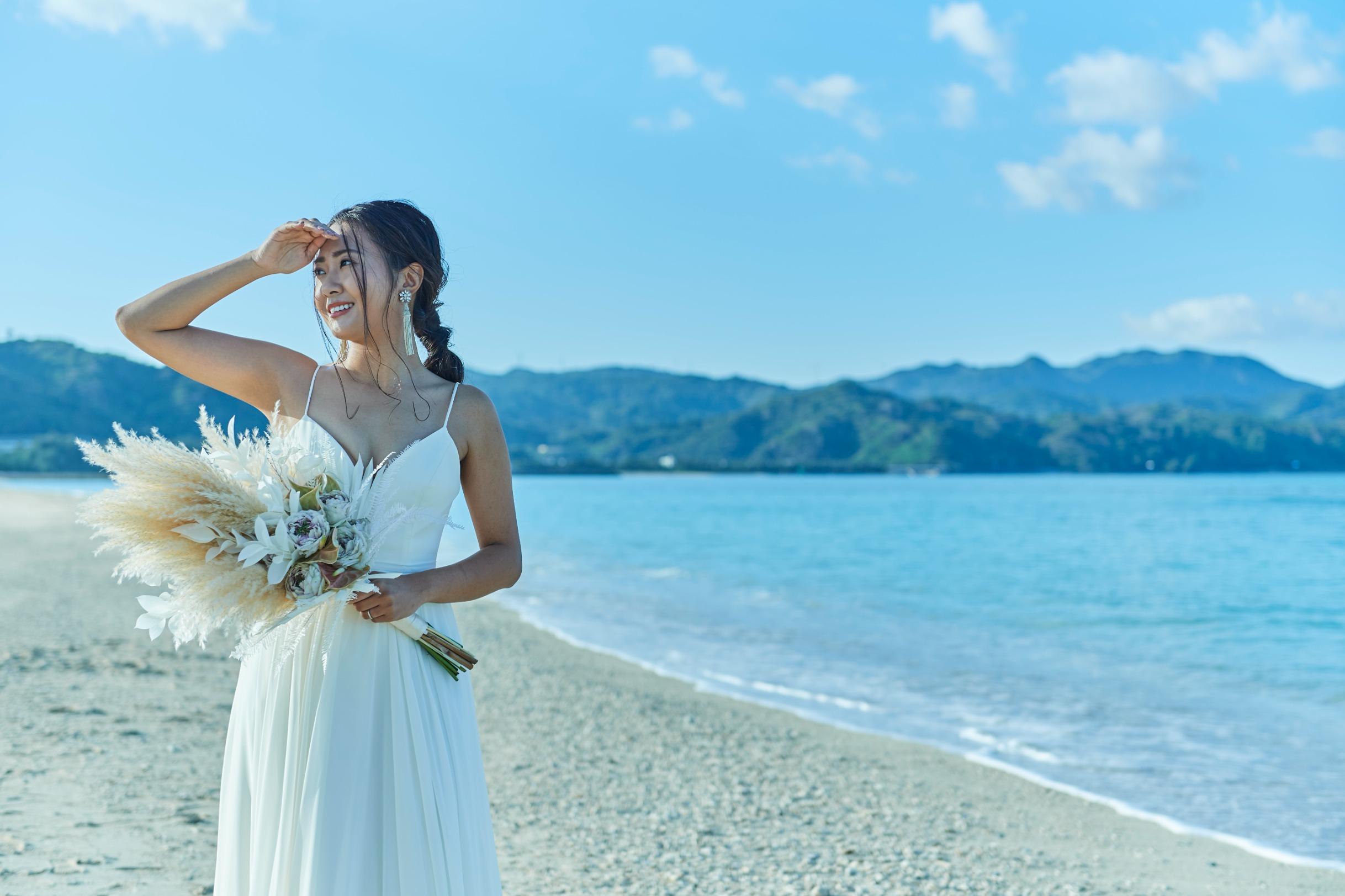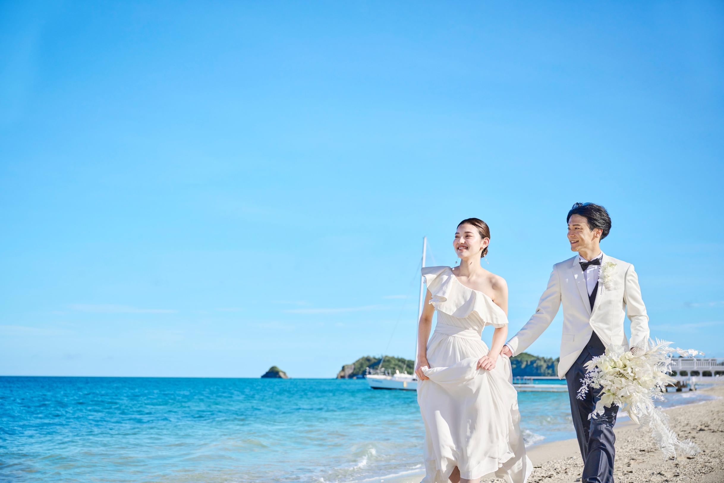 見渡す限りの大空と海、白く輝く砂浜と鮮やかなブルーを背景にリゾートウエディングを満喫した最高のビーチフォトウエディングを。
