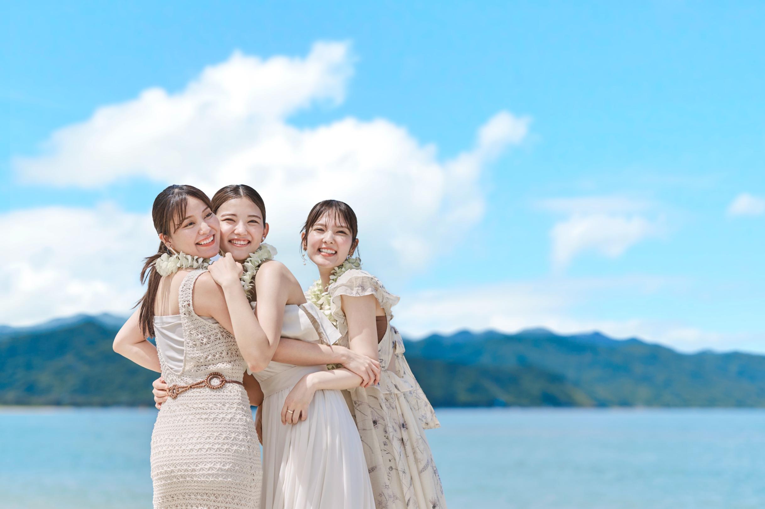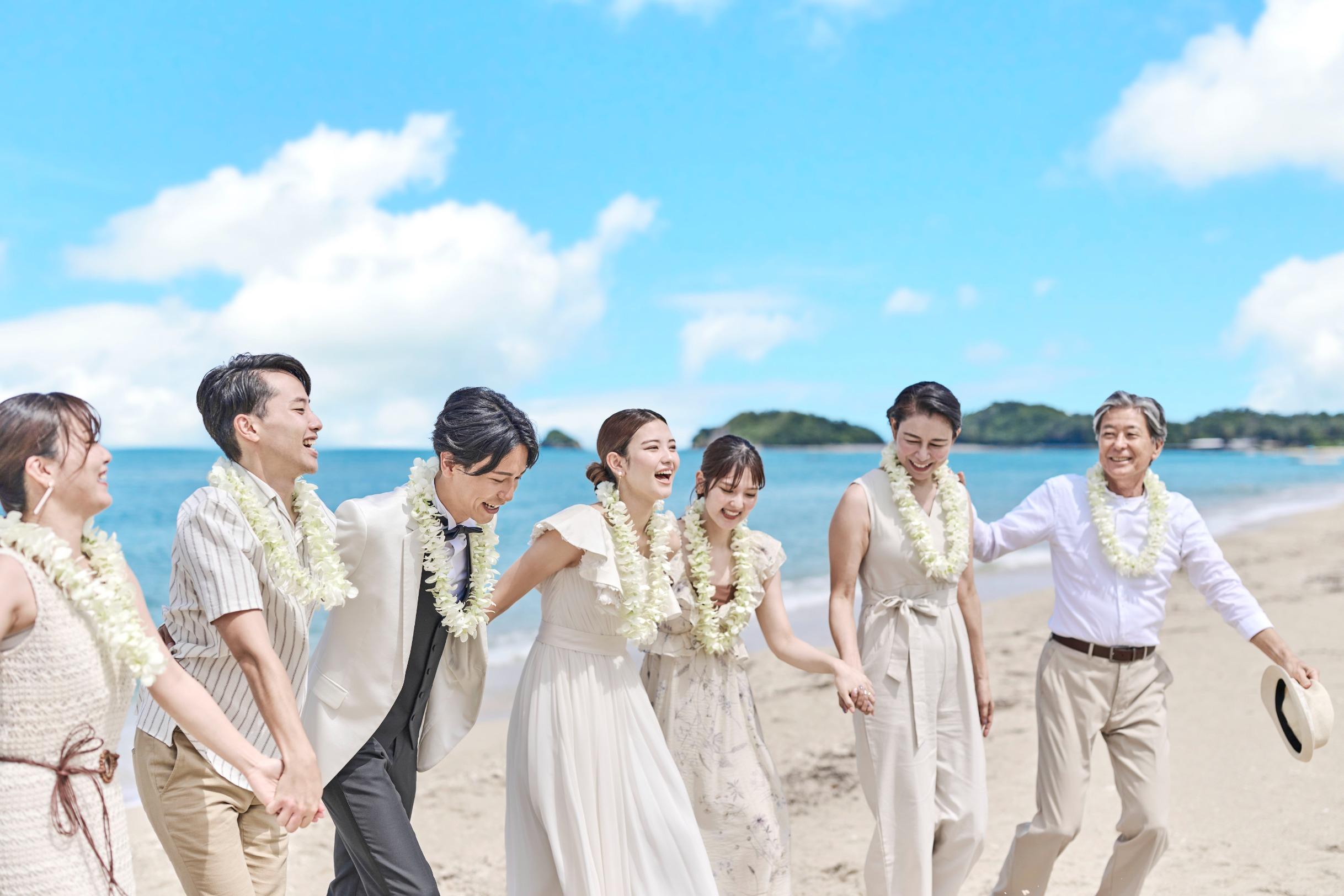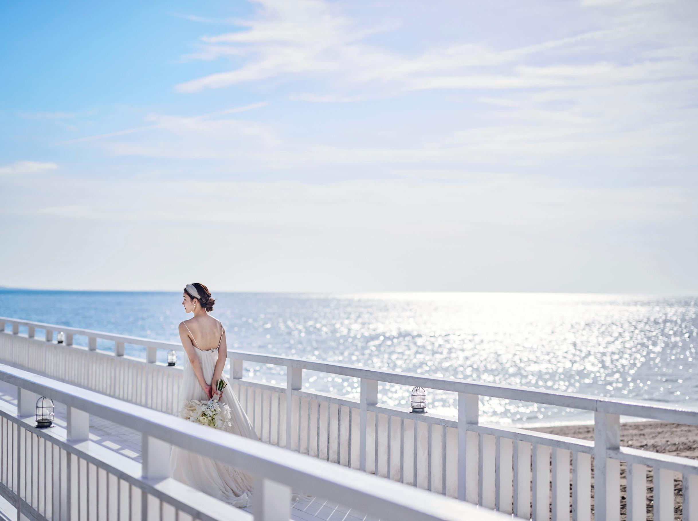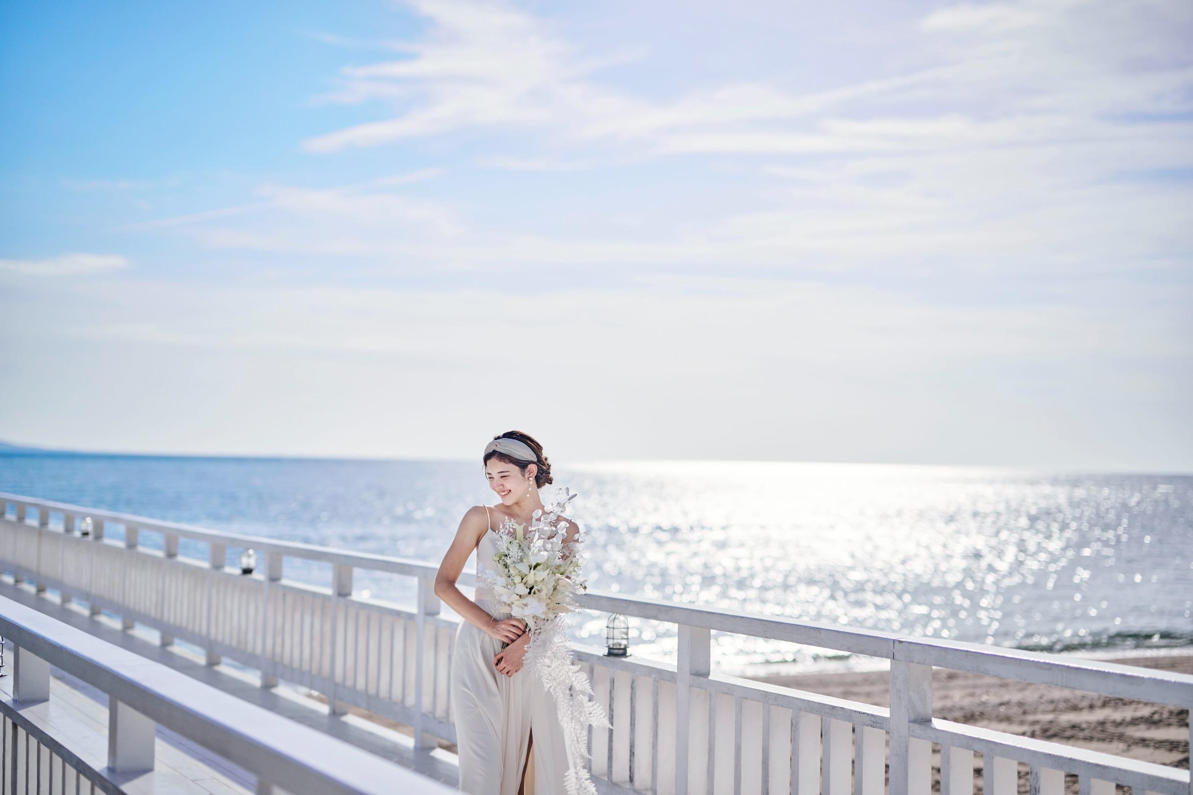 見渡す限りの大空と海、白く輝く砂浜と鮮やかなブルーを背景にリゾートウエディングを満喫した最高のビーチフォトウエディングを。