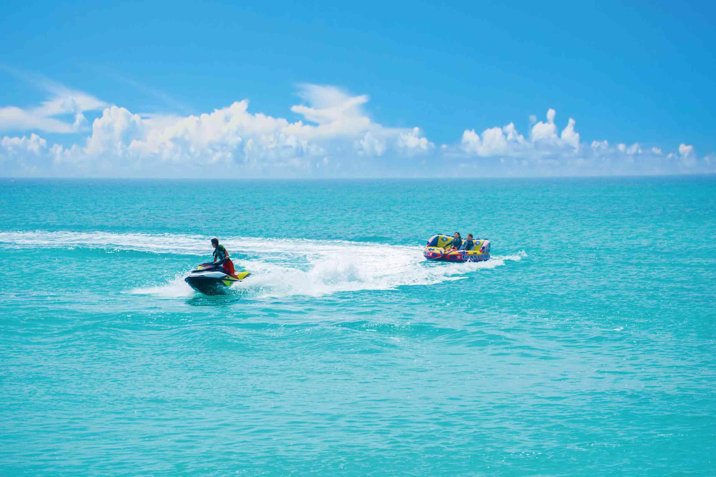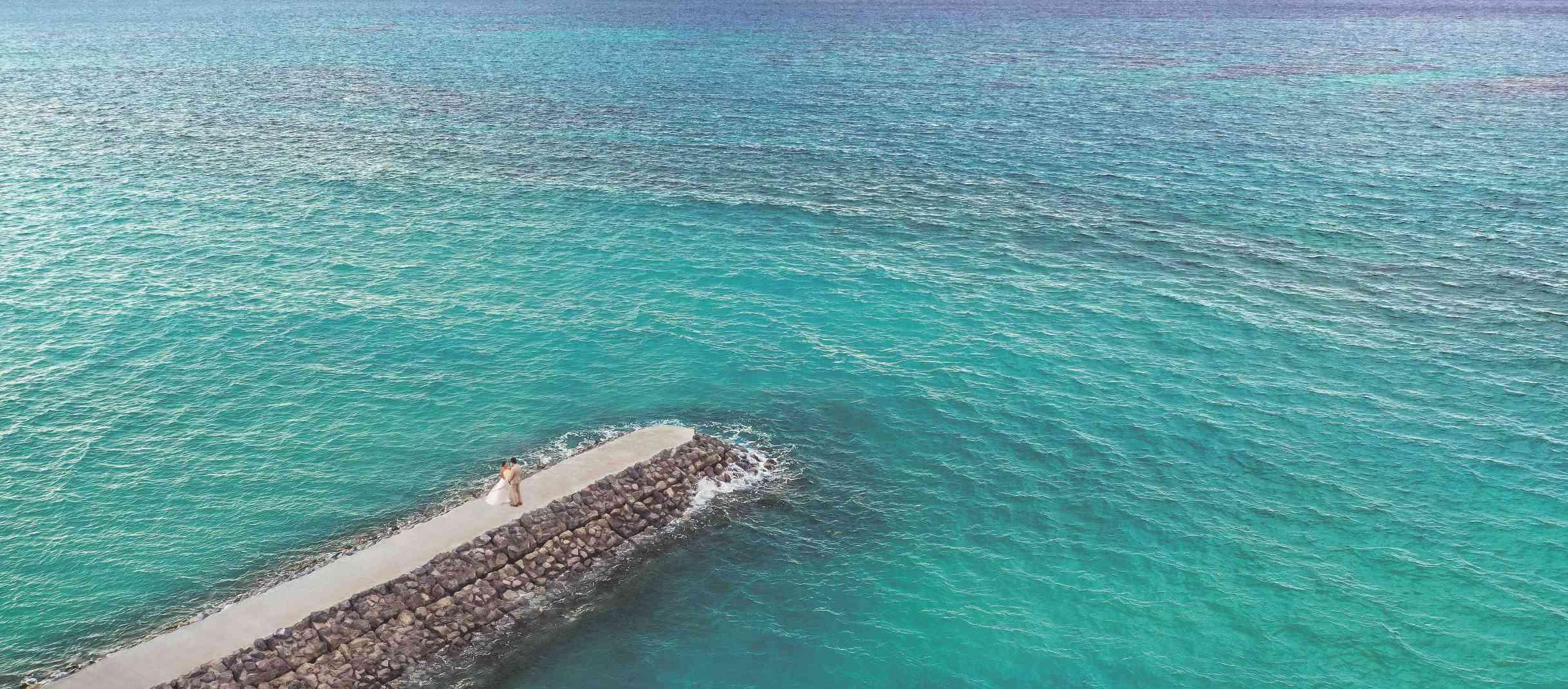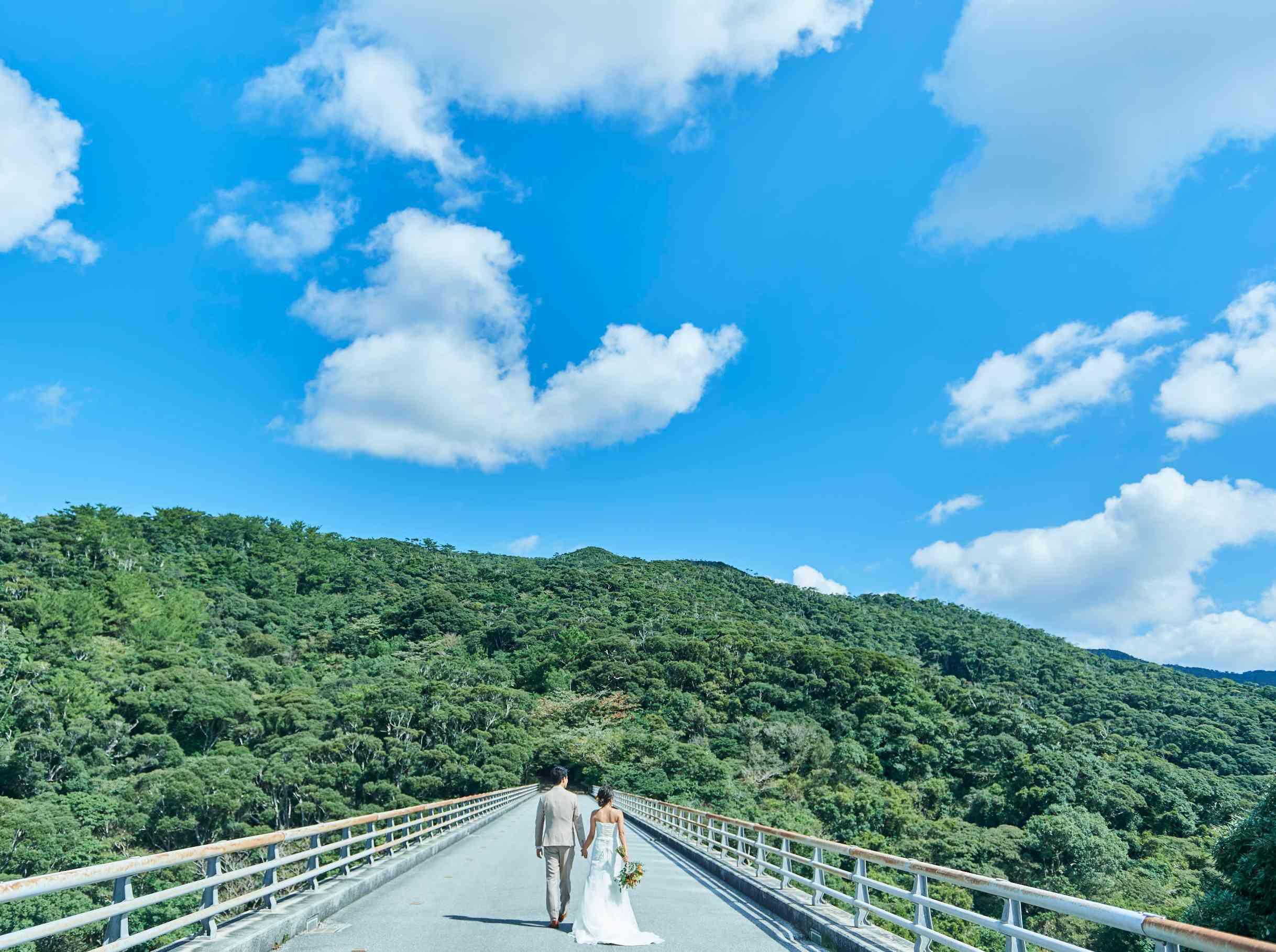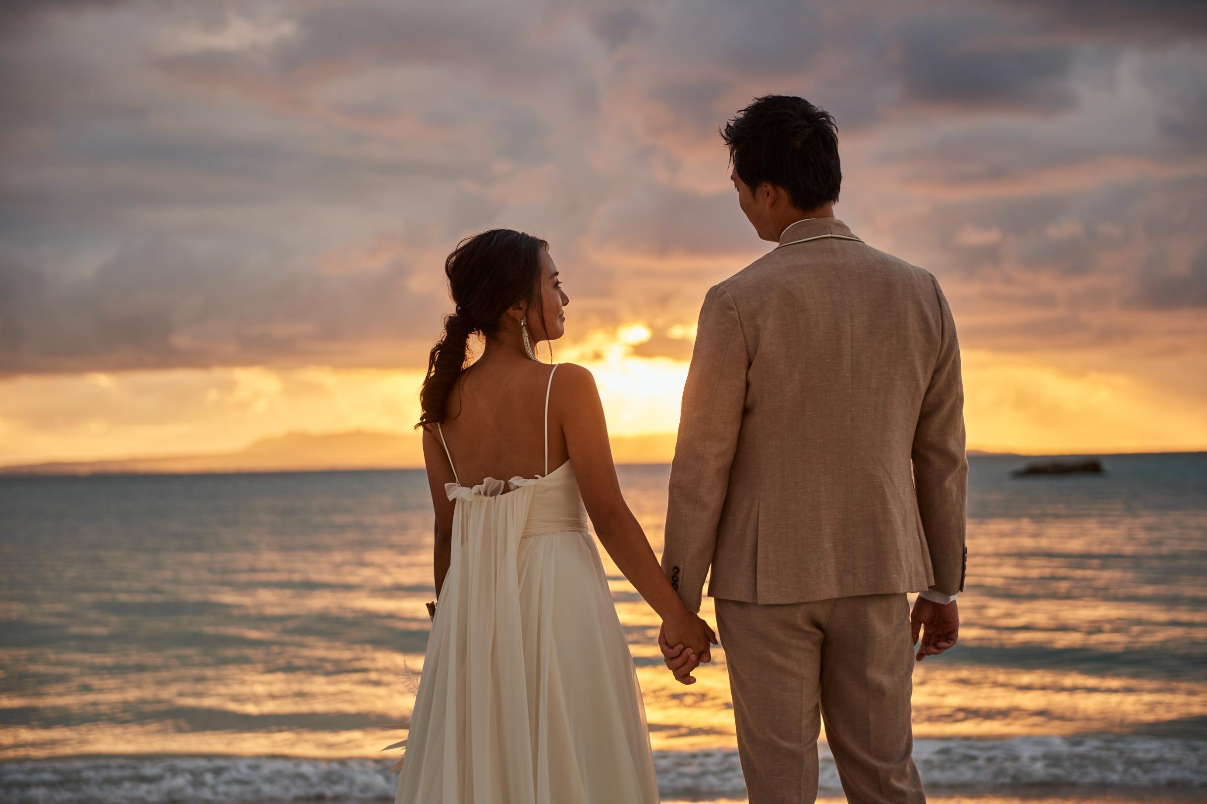 見渡す限りの大空と海、白く輝く砂浜と鮮やかなブルーを背景にリゾートウエディングを満喫した最高のビーチフォトウエディングを。