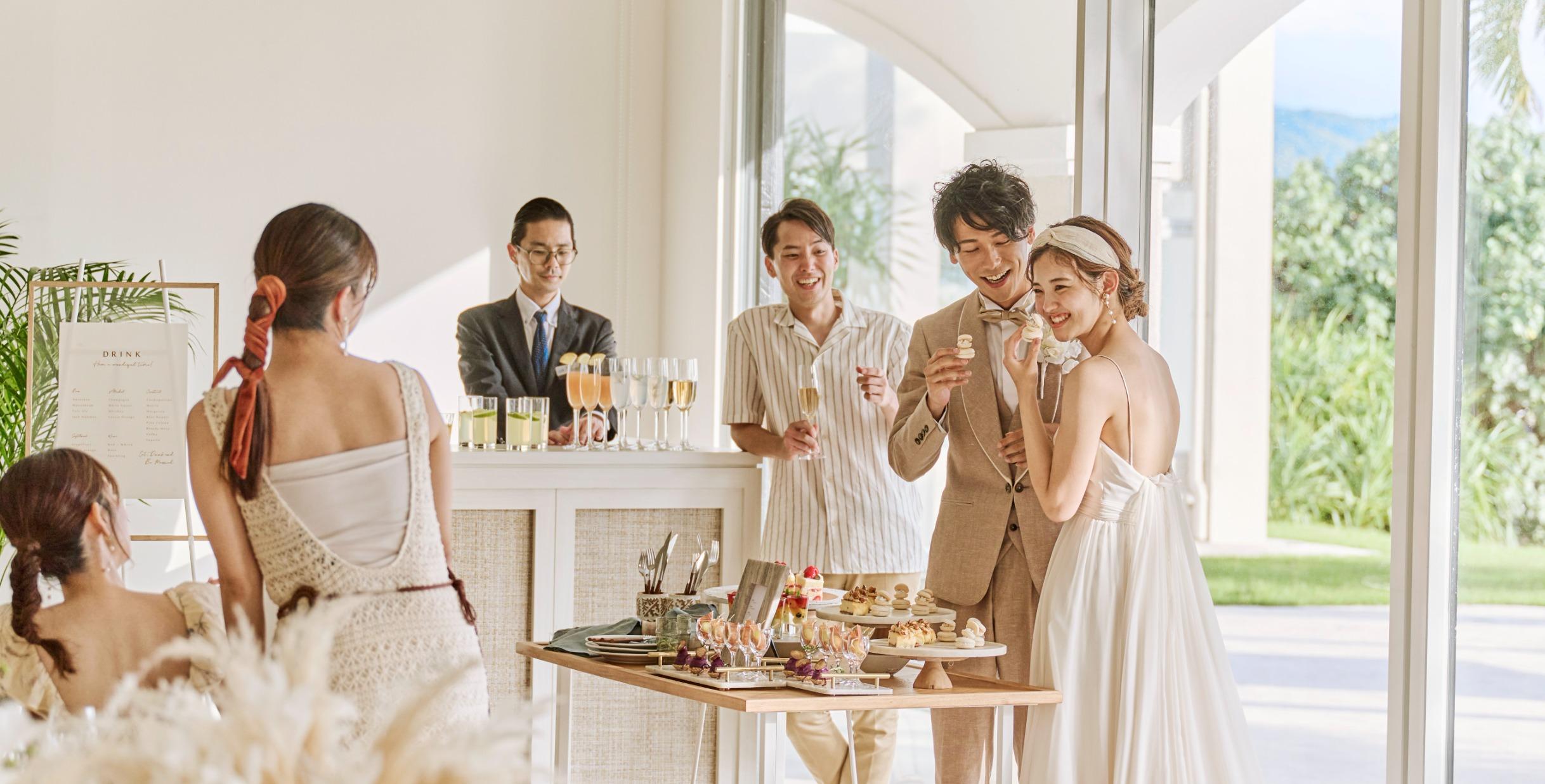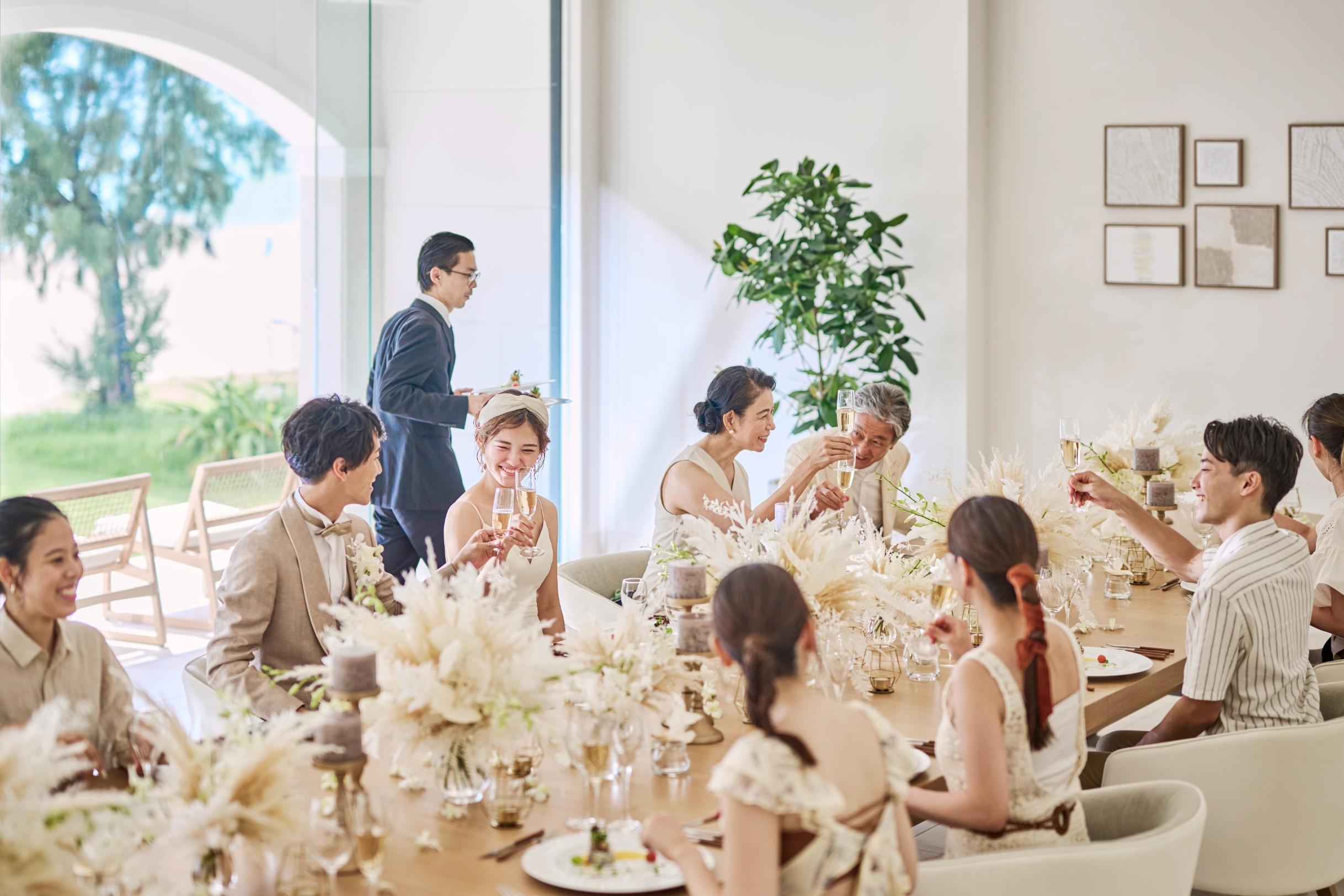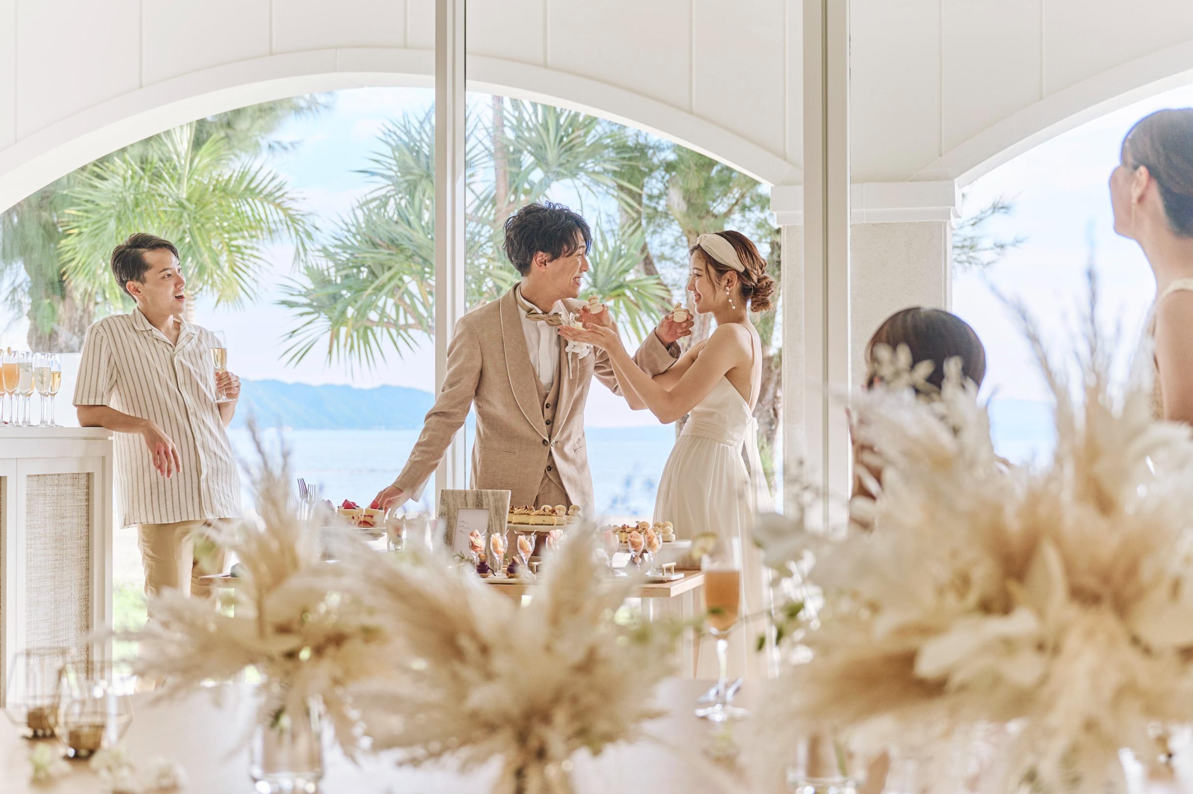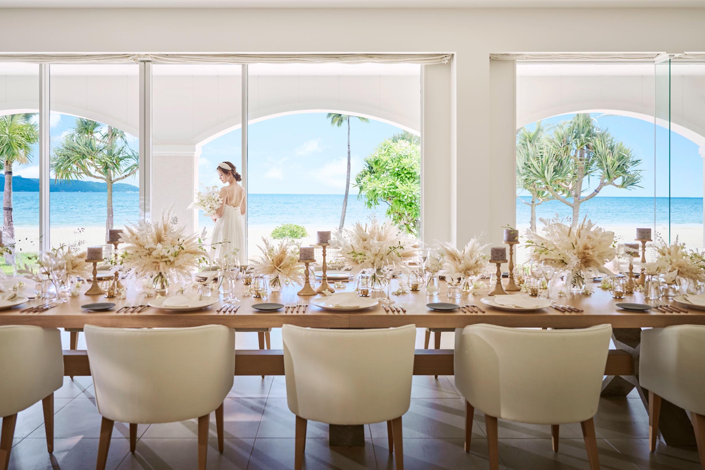 オクマビーチへと続く上質なテラス付きのパーティルームで、沖縄の食材をもちいたフレンチコースやテラスでのケーキカットなど海をみながらくつろぐ「ゆくるパーティ」を。