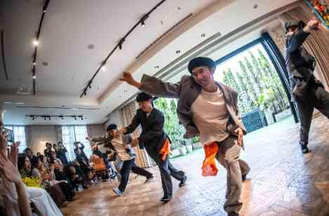 予想外の展開でゲストの皆様の期待を裏切りたい!そんなおふたりに挙式後は披露宴会場へは行かずに、初めに過ごしていたラウンジへ再度ご案内。 すると突然BGMが流れ、カーテンが空くと友人のダンスバトルがスタート! 最後は新郎様も登場し、一緒にダンスのサプライズ。 挙式の感動から一転、会場の熱気は一気に最高潮に!