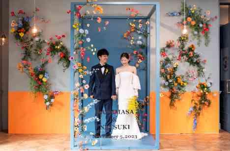 挙式までの待っている時間も楽しんで欲しい、ファッションが好きなおふたりは、ゲストの皆様もせっかくオシャレしてくるなら素敵な写真を残して欲しいと、まるで雑誌の切り抜きのような写真が撮れるBOXタイプにフォトブースをつくりました。 お花も飾られた空間で、ゲストも楽しんで過ごせる時間になり、挙式後にはおふたりとゲストでも撮影できる時間に◎