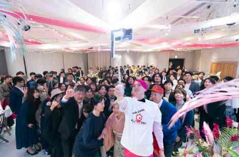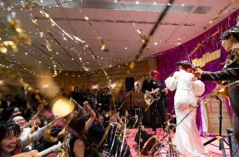 チュールやメインステージでFESのような空間を表現。ケーキの代わりにはおふたりゆかりの広島焼きが登場! ゲストと一緒に青のりや鰹節をかけて完成のセレモニーも大盛り上がり。 前菜もブッフェで行い、よりFESのような体験をしていただきました。 退場後はアンコールでもう一度おふたりが登場し、ライブと言えばの全員集合写真をインカメで撮影「2024年のFESもよろしく!」とおふたりらしい締めの言葉に!