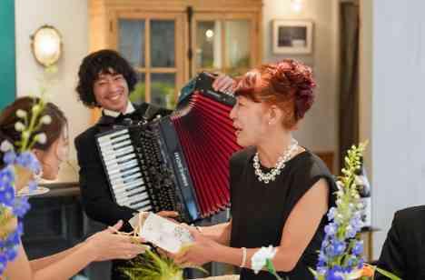 ご親族様との会食はあえてメイン席を設けないスタイル。 ご家族様・ご親族の皆様と一緒に過ごす団らんの時間は、いい意味で"いつも通り"。 当日はお母さまへの誕生日サプライズで新郎様のアコーディオンの生演奏をプレゼント。 小さな頃から見守ってきたご親族様も、笑顔に包まれる、そんな緩やかで温かい時間になりました。