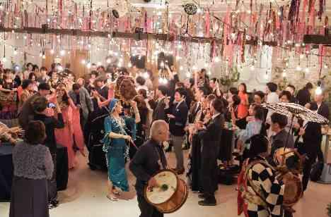 ご家族様との1部とは一転、突然待合のラウンジにちんどん屋が現れ、ゲストの皆様をパーティ会場に誘導。 そこはイルミネーションで華やかに装飾された空間とブッフェでおもてなし。 ゲストの皆様がそれぞれの過ごし方で楽しみ、時に自然とダンスがはじまる。 参加者全員でつくりだすフリーで自由な空間に、ゲスト全員が自然と笑顔に。