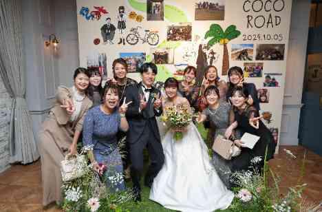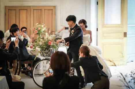 披露宴の入場ではオープニングムービーの後、なんとおふたりが自転車で入場!! 高校生の時、一緒に帰った自転車の帰り道。 当時を思い返し、この瞬間は高校生だったあの頃のように一緒に自転車で入場していただきました。 見守るゲストからは歓声と、懐かしい姿に涙も溢れます。 披露宴の入場もおふたりらしく、色んな入場がゲストを楽しませます。