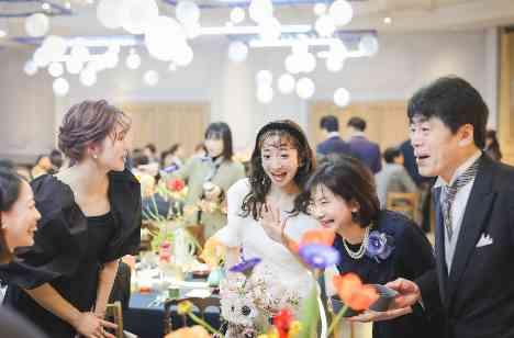 Party後半、ケーキのセレモニーで両家の親御様に登場いただいた後は、そのままそれぞれの両親と一緒に各テーブルでゆっくりするお茶会ラウンドを◎ 親御様もゲストの方一人一人に感謝を伝え、おふたりとゲストの関係性も伝わるような、とても素敵な時間になりました。「ありがとう」「これかもよろしく」と、それぞれの想いを伝えあいます。