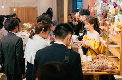お見送りの瞬間まで、おふたりらしさがあふれる時間に。新婦様がかつて働いていたケーキ屋さんの焼き菓子をたくさんご用意し、ゲストに好きな一品を選んでいただきながら、ひとりひとりへ感謝の想いを届けられました。はじまりから結びまで、おふたりの想いと温もりに包まれた、おふたりらしく、心あたたまる一日となりました。