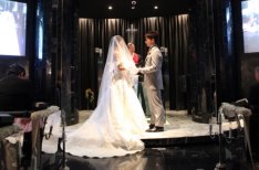 チャペルでゲストをお迎えする迎賓時には、常設のスクリーンに「黒」の意味を映し出した。「あなた色に染まって、私は他の何にも染まらない」。 二人が一生を添い遂げる決意・想いを表現した「ブラックチャペル」であることをゲストのみなさんに知っていただきたかったとおふたり。世界にひとつしかないといわれるこのチャペルで二人だけでなくゲストの心にも残る挙式がしたかったから、ここで挙式を行うことを即決したそう。