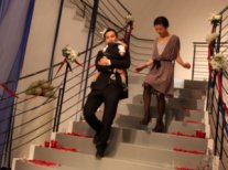 とにかく思いっきり楽しみたいし、ゲストに楽しんでいただく時間にしたいと考えこの演出を考えた新郎新婦。社内に人生の先輩がたくさん。そのなかを代表して、かわいいゲストと一緒に参加してくれた先輩夫婦にこれからの夫婦生活のアドバイスをいただくことに。せっかくだから、新郎新婦の代わりに挙式後のセレモニー中に階段から登場してもらった。 先輩、あの時間、あの言葉は心に響きましたと新郎新婦。