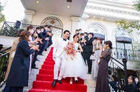 当会場の入り口にそびえたっている大階段はご新婦様にとってブライダルフェアの際から憧れの場所でした。当日はゲストの皆様がご来館されたら一番最初に目に留まるので、ゲスト皆様もフラワーシャワーを楽しんでくださっているご様子でした。レッドカーペット上を満面の笑みでお歩きになるご新郎ご新婦様をたくさんのゲストの方がお写真に収めてくださりました。
