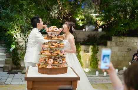 新郎新婦様の中で、親御様への感謝を伝えたい、という思いともう一つゲストの方に見たことのない演出をご覧いただいて楽しんで頂きたいというご要望がありました。結婚式のイメージのケーキセレモニーではなく、あえて、ドーナツにしました。ドーナツタワーの登場の際には新郎新婦様にカーテンオープンをコールしていただき、登場からバイトまで、とっても盛り上がる演出となりました。