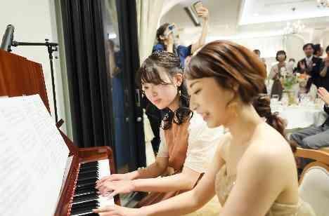 ご新婦様は小さいころからピアノを習っており、ピアノを演奏したいとのご希望をいただいておりました。昔から一緒に連弾をして遊んでいたご友人様もご招待いておりましたので、ゲストの皆様にはサプライズでご新婦様も連弾にご参加いただきました。ご結婚式に向けて沢山練習もしてくださっており、当日は息ピッタリな演奏にゲストの皆様も踊ったり歌ったり、すごく盛り上がる演出になりました。