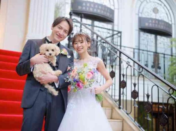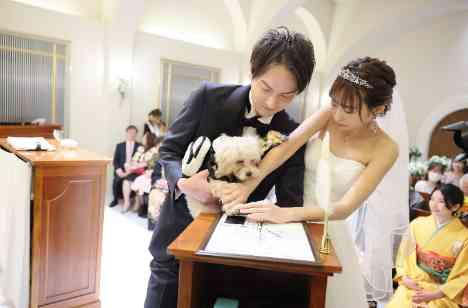 ご結婚式のお打ち合わせ中に家族になった愛犬ちゃん。おふたりの挙式スタイルは、教会式でしたが、おふたりにご署名をしていただいた後に愛犬のワンちゃんに結婚の承認として、肉球サインをしていただきました。その後ゲストの皆様に結婚証明書をご披露していただいた際には温かい拍手が沸き起こりました。披露宴中はロビーに飾ってゲストの皆様に見ていただけるようにいたしました。