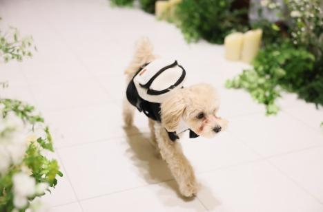 家族になったときから絶対にやっていただきたいと思っていた、リングドック。当日はリュックの中にふたりの結婚指輪をお入れして、愛犬のワンちゃんに登場していただきました。挙式前のリハーサルでは沢山寄り道しながらおふたりの元へ指輪を届けてくれましたが、本番は一目散に新郎新婦の元へ走って届けてきてくれました。