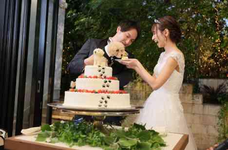 アーカンジェル代官山では披露宴会場内のテラスまでわんちゃんに入っていただくことができます。そのため、ケーキ入刀をそこのテラスで行い、王道の新郎新婦様でのファーストバイトではなく、ワンちゃんへのケーキバイトを行いました。まだ一才の愛犬ちゃんは初めて見るケーキに興味津々でしたがなかなか召し上がらず、最終的には新郎様がケーキをバイトされて召し上がっていただきました。