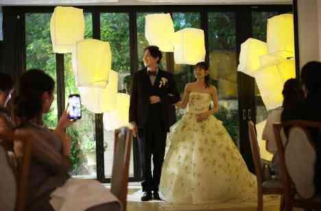 新婦様がどうしてもやってみたかった演出のランタン。当日はあいにくの雨模様でしたが、進行を変更してテラスの所にランタンを飾り、ランタンの中新郎新婦に登場をしていただきました。映画の中の音楽とともにカーテンが開いた瞬間、ゲストの皆様からの完成が絶えなかった再入場となりました。ゲストの皆様にも沢山お写真を撮っていただきました。