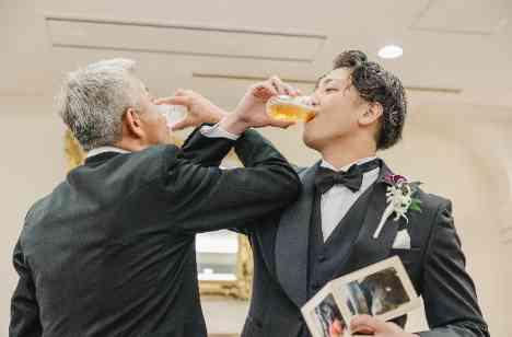 実はお酒が得意ではない新郎様…。 お父様は世界一お酒が強いそうで、 いつかお父様とお酒を交わしたいと思っていたとのこと。 結婚式という特別な日だからこそ、お色直し中座のエスコート役をお父様に指名し、 ふたりでビールを飲んでいただくことをご提案しました。 親子の絆に会場は笑顔と感動に包まれました!