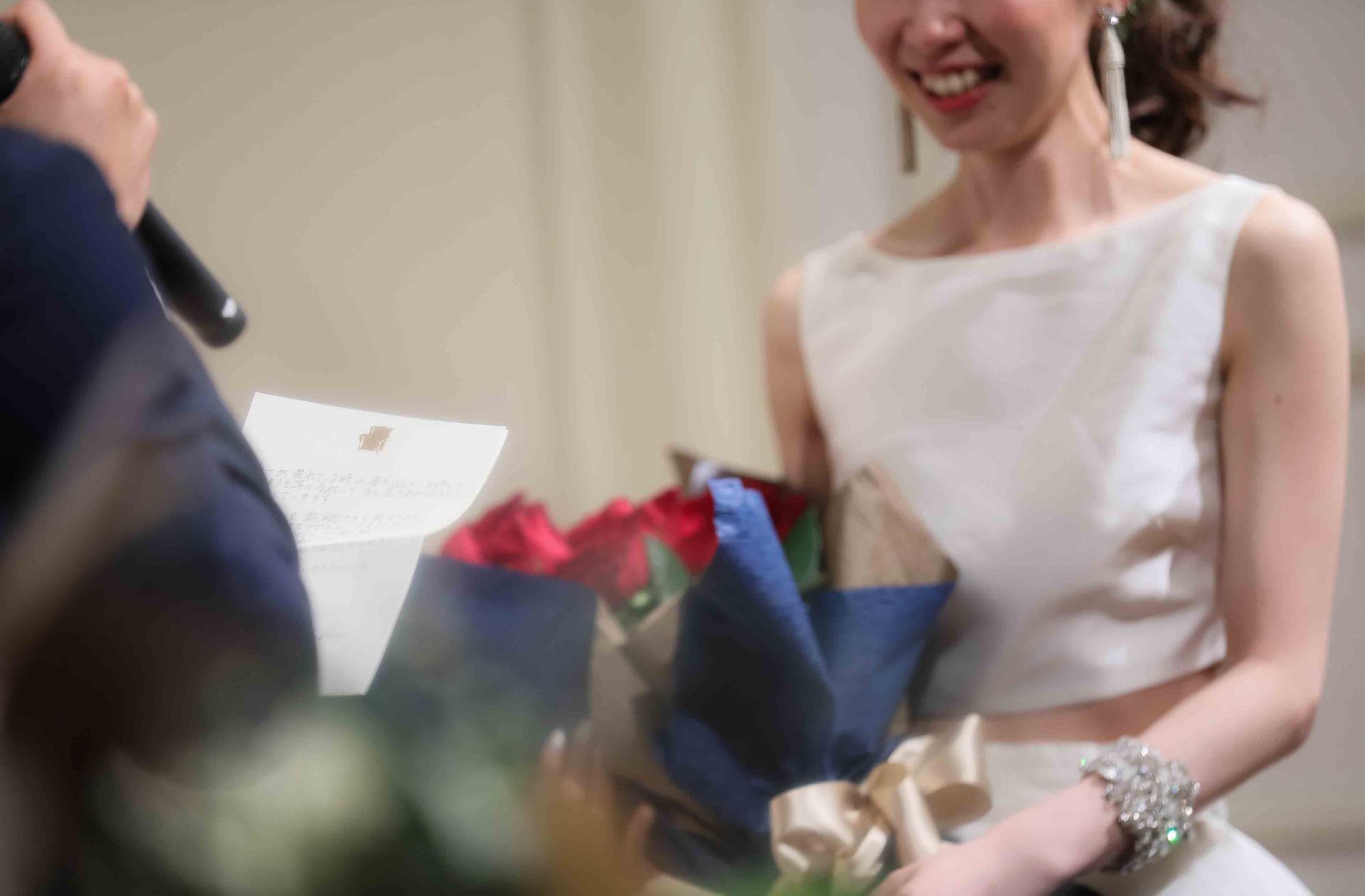 一つ目は新婦親御様からのサプライズ。お母様と天国にいるおばあ様からのお手紙をいただき、司会から代読させていただきました。愛のこもったメッセージを聞きゲストの皆様も感動されていました。 二つ目はご新郎様からのサプライズ!エンドロールのラストカットはバラの花束を抱えたご新郎様。44本のバラの花束には【変わらぬ愛を信じます】という意味が込められており、ご新郎様からの愛が感じられるプレゼントとなりました!