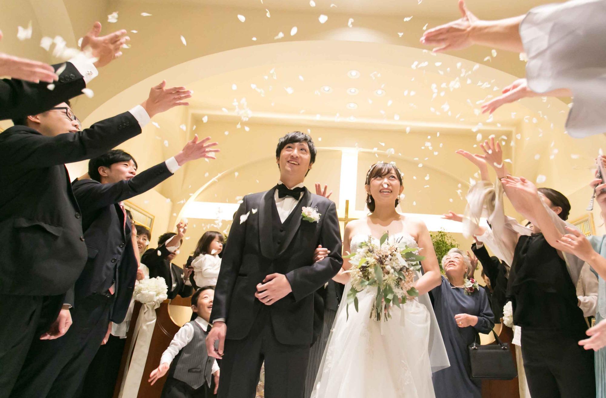 バージンロードはご新婦様の人生ではなく、お二人の人生に見立て、両サイドから中央に向かって歩んでいただきました。退場シーンではゲスト皆様から一斉に祝福のフラワーシャワーを!
