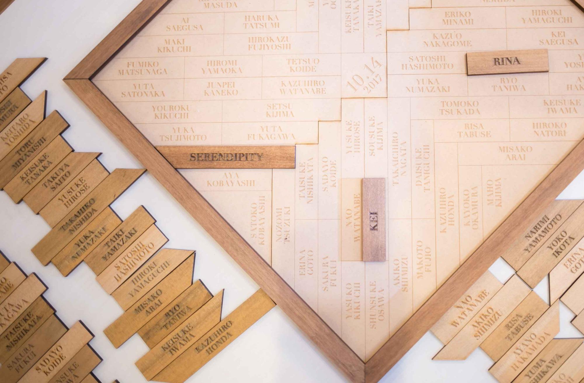 人前式で使う結婚証明書はオリジナルのヌプシャルボードで。ゲスト一人一人のお名前が刻印されたピースをはめていき完成させました。