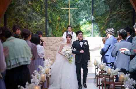 チャペルの天井からは太陽のあたたかな光が降り注ぐ中、大切なゲストの皆様の前でふたりは永遠を誓います。チャペルの後方はガラス張りになっていることで、バージンロードはお父様と、マザーズロードはお母様と歩いていただきました。お母様ともご一緒に歩くことで普段は中々伝える事が出来ない感謝の気持ちも、入場前に伝えていただけます。
