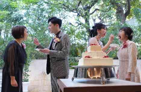 お友達とは沢山お話をしたり、お写真を撮りたい、というご希望の新郎新婦様でしたが、ご両家共に親御様にもとっても感謝をしていらっしゃいました。そこで、普段は新郎新婦様で行っていただくケーキバイトですが、日頃の感謝の気持ちを込めて、サンクスバイトとしてお母様にもバイトをしていただきました。サプライズでお呼び出しをされたのでお母様たちは驚きながらもとっても嬉しそうにケーキを召し上がってくださいました。