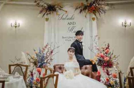 冬らしいたくさんの花材を使用して華やかな空間に仕上げました。おふたりとフラワーコーディネーターとお打合せをし、デコレーションシートをもとに、様々な組み合わせ、パターンを一緒に考え、おふたりのご衣装と合った装飾に。おふたりのメインのお席は、ゲストの皆さまが1番お写真に残される空間の一つ。より華やかに、ご衣装が映える装飾にされました。