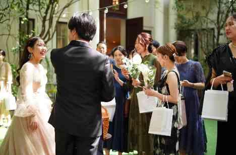 お色直し後はガーデンに出て写真を撮ったり、会話をしたり、デザートブッフェを楽しんだり。ゲストの皆様の笑顔と緑溢れる温かなお時間をお過ごしいただきました。 そして結婚式が結んだ後にはひとりひとりに「ありがとう」の気持ちを伝えながらお見送り。ゲストからは自然と「今までで1番楽しかった」「とてもふたりらしい式だった」との感想が。