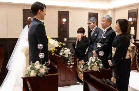 結婚式をする意味は今まで一番お世話になった親御様のために。幼少期、学生時代、社会人になってから、いつも味方でいてくれた親御様にはしっかりと感謝の気持ちを伝えたいそんな気持ちをおふたりから強く感じました。お二人と親御様だけで過ごす挙式が始まる前の時間。幼少期のころのお写真を見ていただきながらお待ちいただき、お二人の大きくなった姿、晴れ姿を一番最初に見ていただきました。