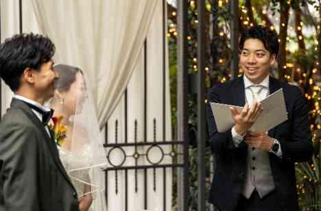 挙式もおふたりらしさがあふれる人前式のスタイルに。おふたりのご縁を繋げてくださったキューピッドのご友人にお願いして、おふたりにはサプライズで誓いの言葉をご用意!おふたりのことをよく知るご友人だからこそ、笑いあり、涙あり、シリアスあり、おふざけあり…?!な誓いの言葉に。そんなおふたりらしさ全開の誓いの言葉に、ご友人もご家族も笑いが止まりませんでした。
