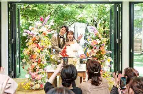 ガーデンと隣接している披露宴会場では会場内だけではなくガーデンも使いながらのパーティーが行えます。ガーデン背景に行ったケーキセレモニーは写真映えがしてとっても素敵です。おふたりを囲むようにゲストは近づいてセレモニーを見守ります。その後はガーデンでお酒片手にゆっくり歓談時間をおとりしたり、いろいろなお時間をご提案できます。