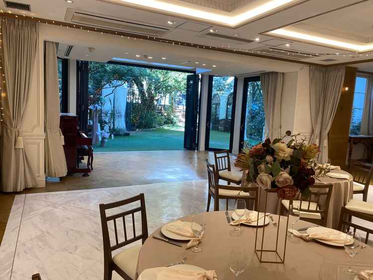 ガーデンが思ったよりも小さく、寂しく感じてしまった。披露宴会場とガーデンが繋がってはいるものの接地している面積は大きくなく、奥の席からだと遠く感じた。
