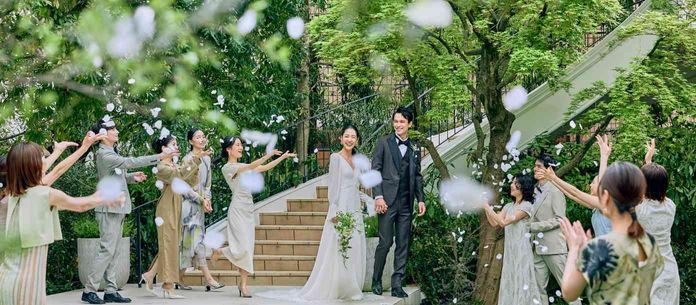 プールガーデンへと続く螺旋階段では歓喜と祝福に包まれるフラワーセレモニーを