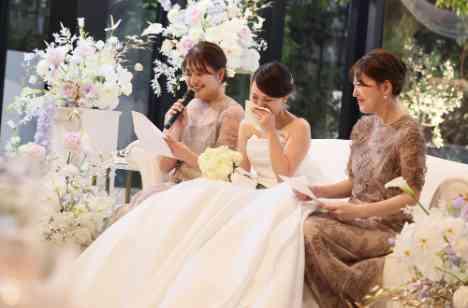 家族からも3姉妹とよく言われていた幼馴染のおふたりが友人スピーチを引き受けてくれました。よくあるスタイルは友人は前に出て起立してメイン席にいる新郎新婦を見ながらスピーチをされますが、間柄とメイン席もソファスタイルだったので両サイドに友人にはサプライズで座ってもらい、温度感がより伝わる空間でスピーチを行っていただきました。涙と笑顔、笑い、たくさんの感情が溢れた瞬間でした。