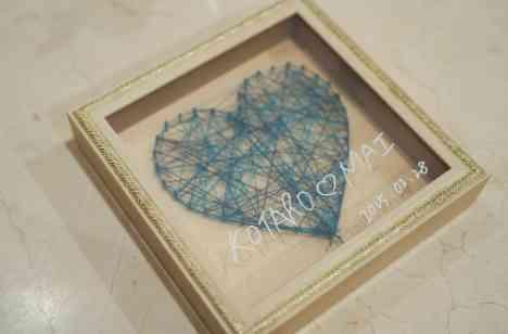 お二人がお仕事で扱っておられる服。その服を作る生地は沢山の糸が張り巡らされ、できていることをモチーフに、ゲストの皆様に自由に糸をかけてもらい世界に一つだけの結婚証明書を作りました。 ゲスト様おひとりおひとりに参加していただける特別でお二人の想い出に残るアイテムになり新居に飾っていただいております。