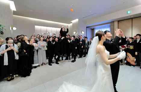 挙式後のアフターパーティでは、バスケきっかけで出会われ、一緒にプレーをする程バスケが大好きなおふたりからのボールトスで盛り上がりました。キャッチできた方にはおふたりからの特別なプレゼントをお渡ししました!ゲストもわくわくドキドキ楽しむことができ、ゲストの一体感がうまれた瞬間でした!アフターパーティで温度感を高めることで披露宴の盛り上がりも最高潮に!