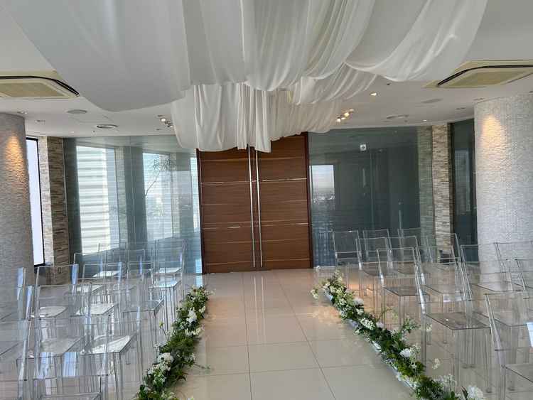 高層階なので窓からの景色がとても綺麗でした。夜景だともっと素敵なんだろうなと思いました。チャペルの大きさも程よいなと思いました。