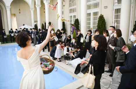 ヴィクトリアハウスでは大きなプールが付いているガーデンとなっており、ブーケトスやバルーンセレモニーなども人気ですが、是非ゲスト全員へ楽しんでいただきたいという方ならではの演出『お菓子まき』がお勧めでございます。 盛り上がるBGMに合わせて、懐かしのお菓子を沢山、ゲストの歓声の中大盛り上がりでした。