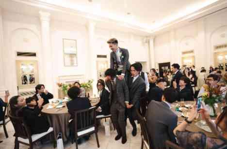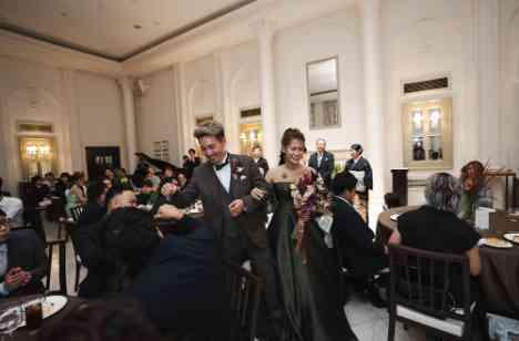 学生時代の仲良しなご友人様を思い出の曲と共にお呼びいただき、友人と横に並んで歩いてご中座をするのではなく、皆様でお話いただき騎馬戦で中座! 見守るゲストの方々も思わず笑顔になり、近くを通る際に声がけをしてくださるそんな温かいお時間となりました。 その後は仲良しなご友人様と一緒に記念撮影をして思い出になる時間を過ごしていただきました!