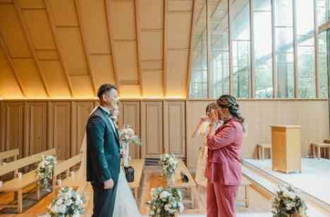 お2人のお仕度後、誰よりも1番初めにウェディングドレスとタキシード姿をご覧いただいたのは大切なご友人様。 チャペル内でご友人様にお待ちいただき、後ろを振り返るとそこにはご新郎・ご新婦様のお姿が。 思わず涙がこみ上げるご友人様とお話するお時間やお写真撮影のお時間等、温かいお時間をお過ごしいただきました。