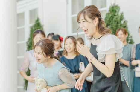ゲストの方にも楽しんでほしいというお2人だったので、挙式後はプールのあるガーデンで皆様とプレゼントトスを行いました。 お2人との距離感も近いため、ゲストの方と一体感のあるお時間をお過ごしいただくのはもちろん、全力で楽しんでくださっているからこそ、こんなに楽しそうな表情となりました。 自然な笑顔が溢れるお時間となりました。