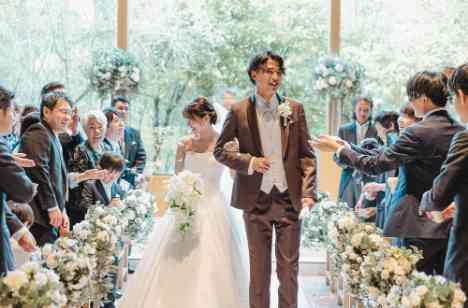 感動の挙式が結んだあとは、ゲストの皆様から祝福のフラワーシャワー。 距離感が近いからこそ、皆様から温かいお言葉や祝福の言葉をいただきながらバージンロードを歩いて退場するご新郎・ご新婦様。 自然が溢れるチャペルで、お2人だけではなくゲストの皆様も思わず自然な笑顔になるそんなお時間を過ごしていただきました。