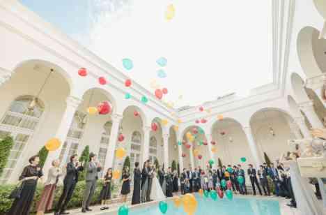 当館のヴィクトリアハウスにはプールがございますので、ドロップアンドフライという演出をご新郎様のご希望で当日行いました! ゲストの皆様へサプライズ感もあり、笑顔溢れるそんなお時間を過ごしていただきました。 カラフルなバルーンはお写真映えもするため、人気の演出です! 当日はゲストの歓声と共にバルーンが